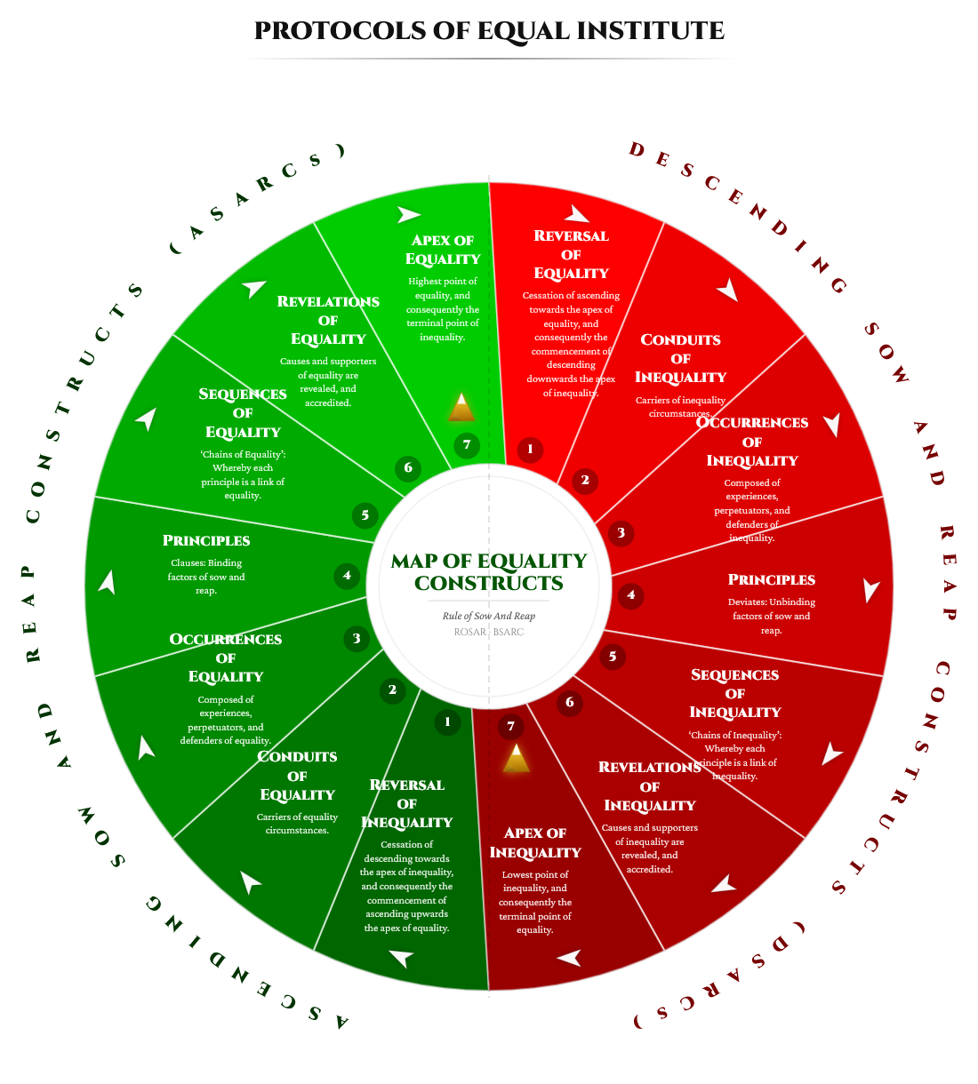 Every INOSAR has Ascending Constructs and Descending Constructs. Ascending Sow And Reap Constructs (ASARCs) are progressions that aspire towards the Rule of Sow And Reap (ROSAR). Descending Sow And Reap Constructs (DSARCs) are regressions that deviate from the ROSAR. To make it simple, Ascending Constructs progress towards achieving equality while simultaneously desisting and potentially terminating inequality. In contrast, Descending Constructs are regressing away from equality while simultaneously assisting an potentially perpetuating inequality. It’s possible that every INOSAR is either in a state of ascent, or descent, that is until it is actively reversed or prevented.